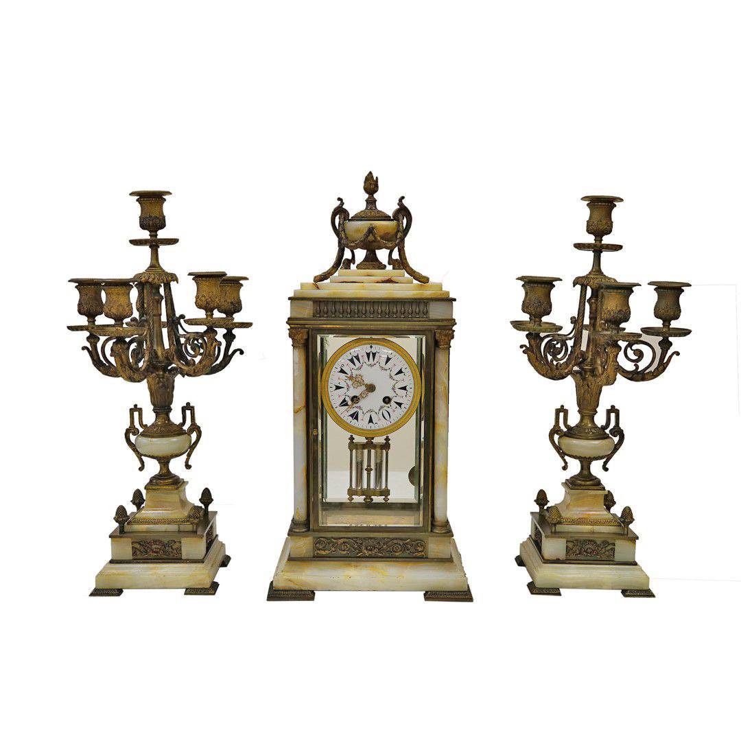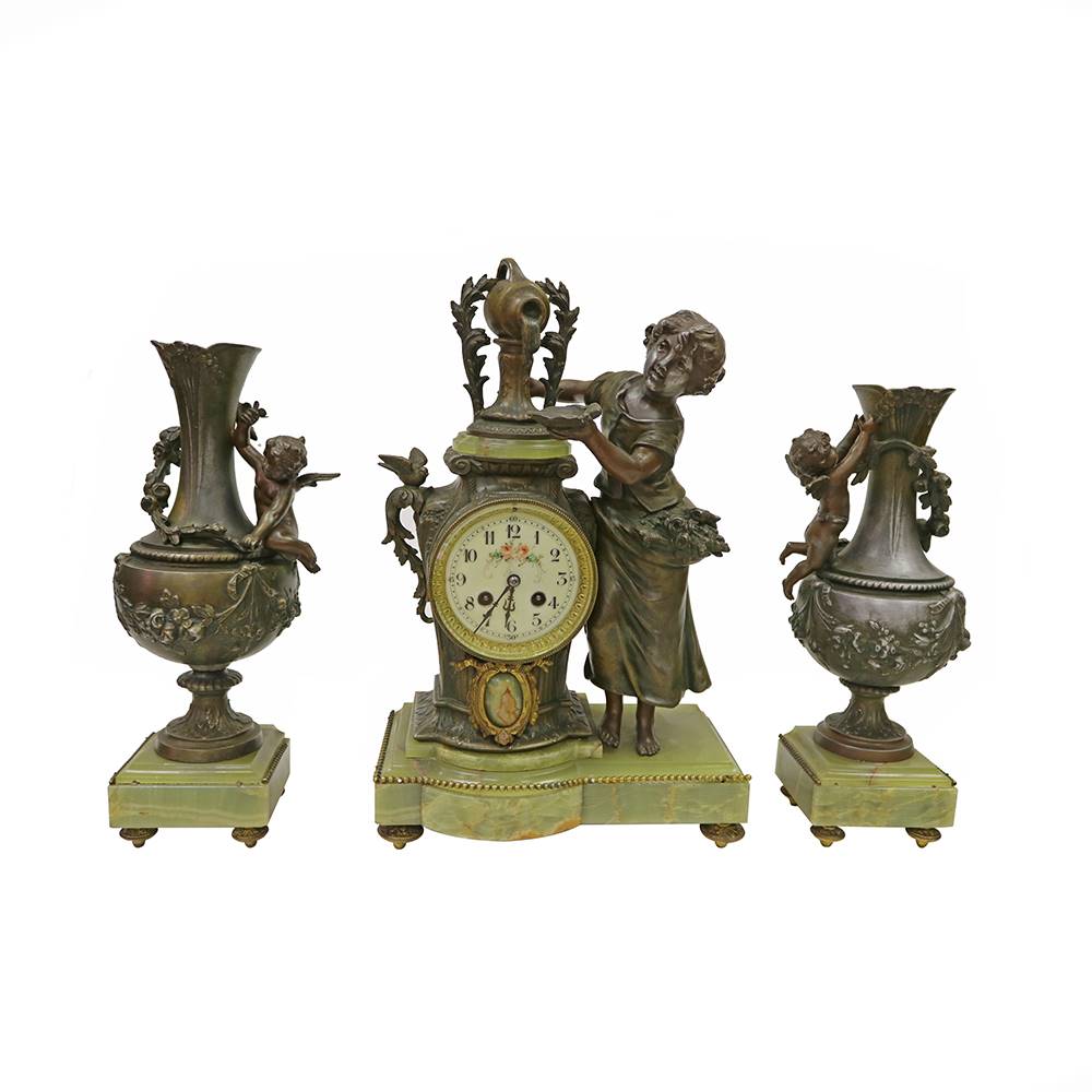 ONYX MERMERLİ, BRONZ HEYKELLİ SAAT TAKIMI