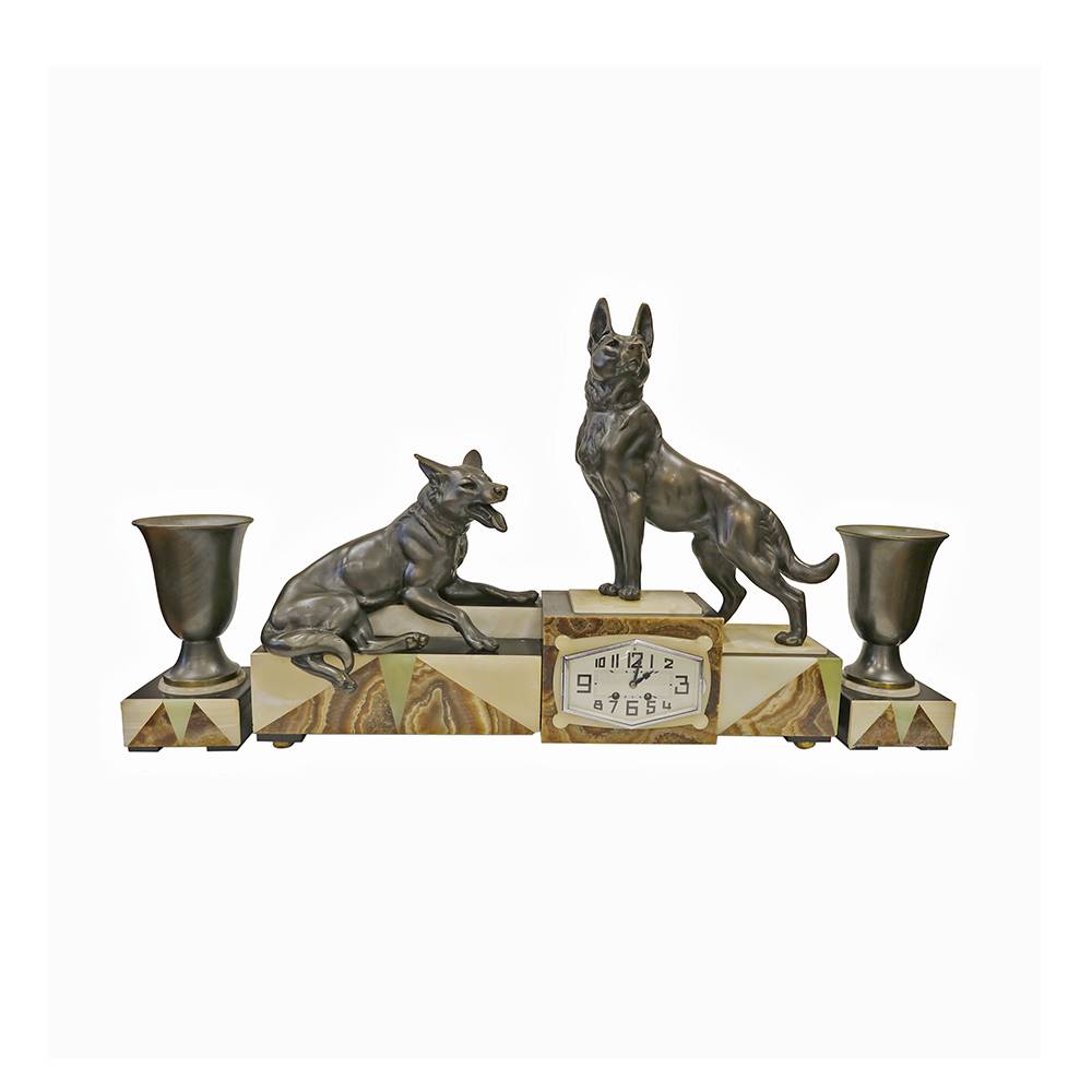 MERMER ZEMİNLİ, BRONZ KÖPEK FİGÜRLÜ SAAT TAKIMI