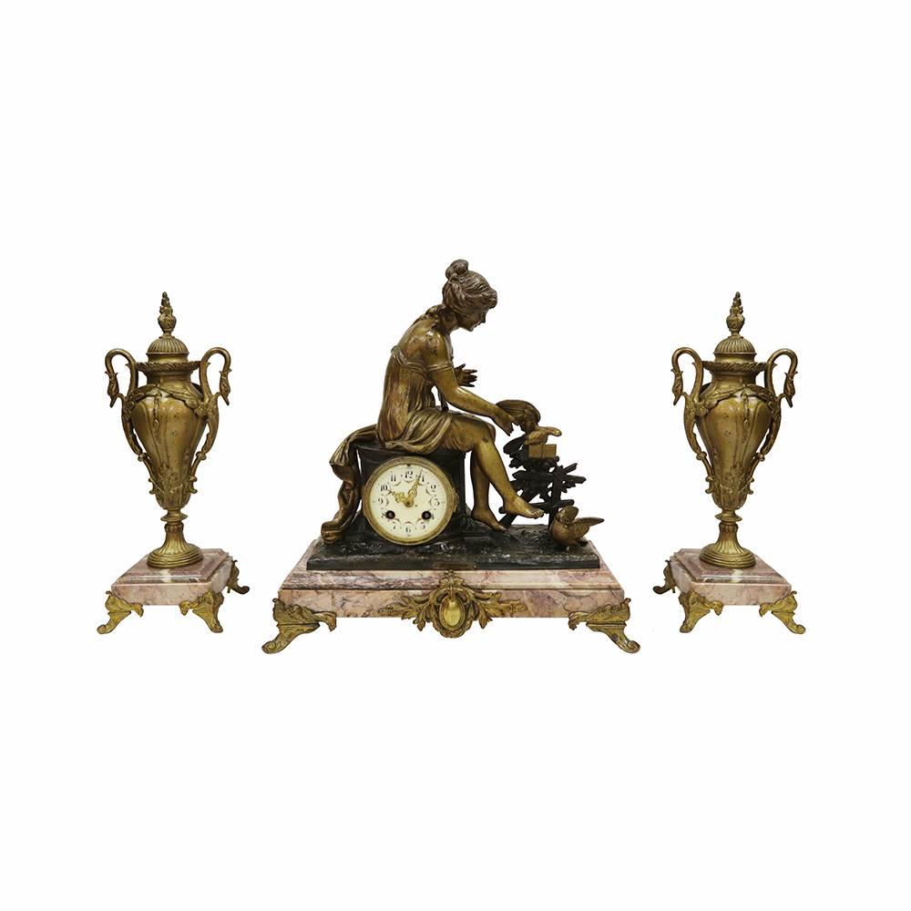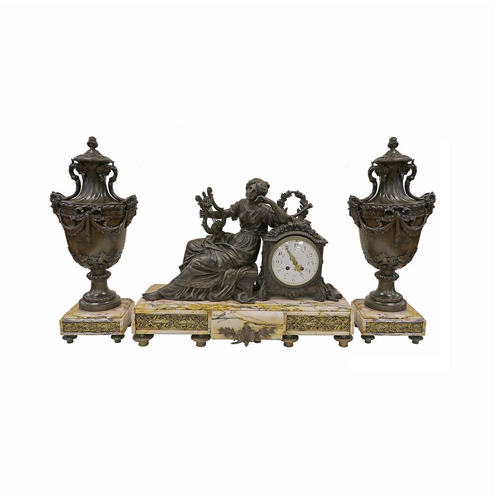 BRONZ FİGÜRLÜ, MERMER ZEMİNLİ SAAT TAKIMI