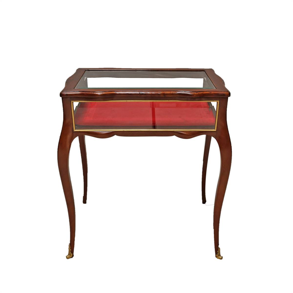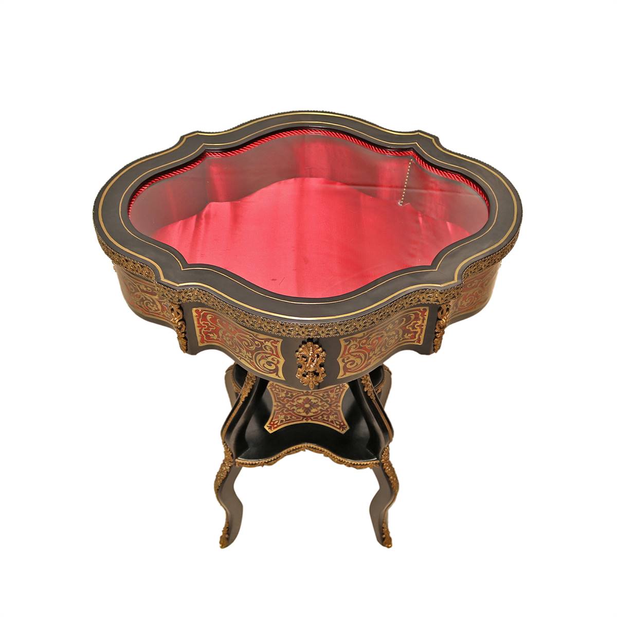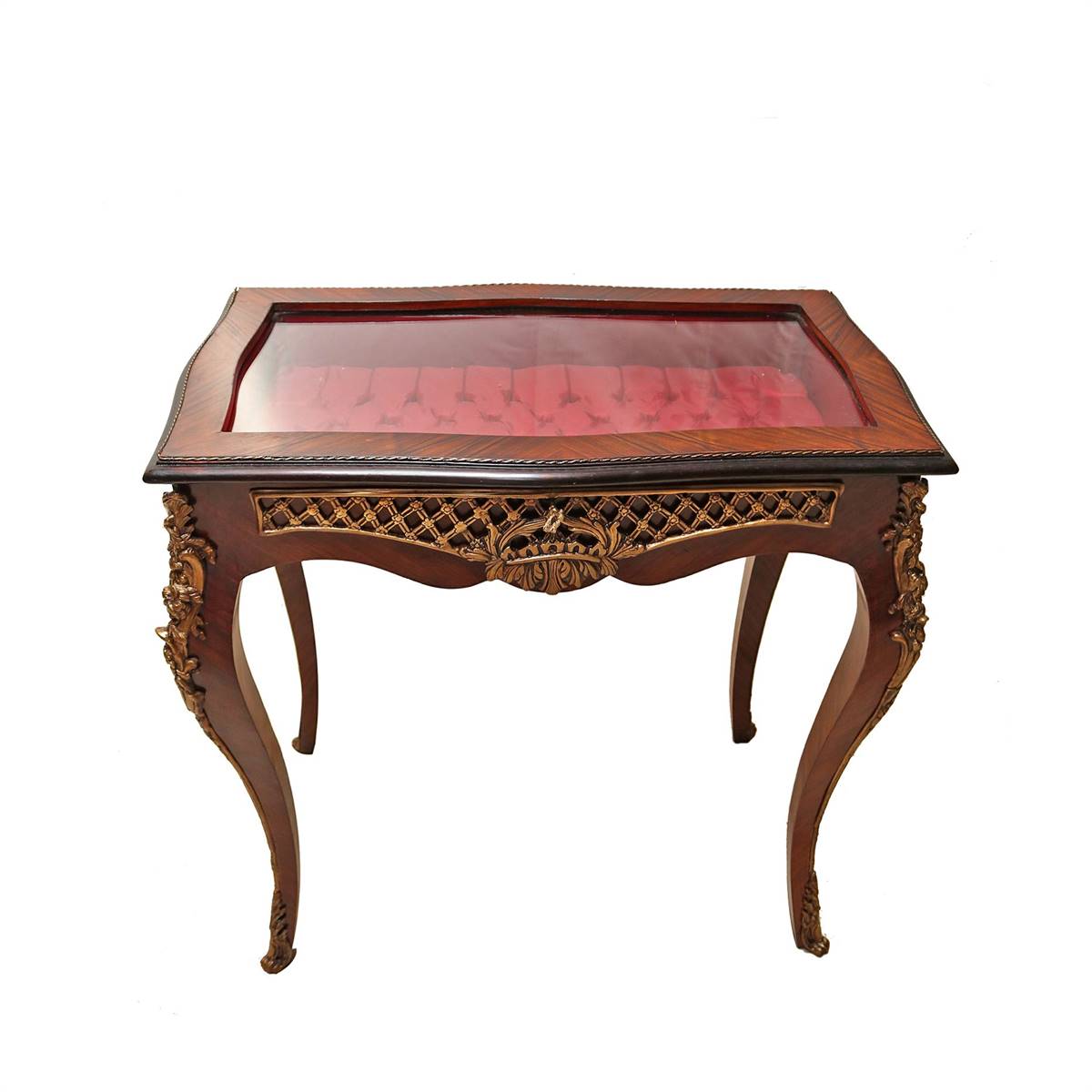 İÇİ KIRMIZI KUMAŞLI, BRONZ DETAYLI AHŞAP TEŞHİR SEHPASI
