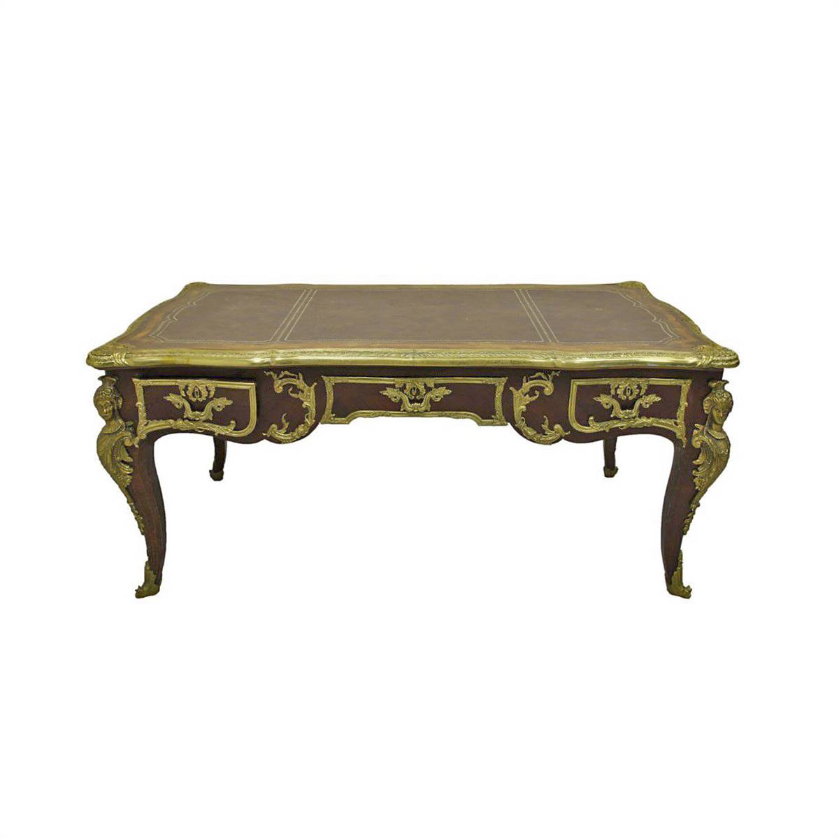 Fransız maun, açılabilir marküterili, ayakları bronz detaylarla süslenmiş yemek masası ve 6 adet krem rengi kumaş ile kaplanmış maun sandalyelerle tamamlanmıştır.